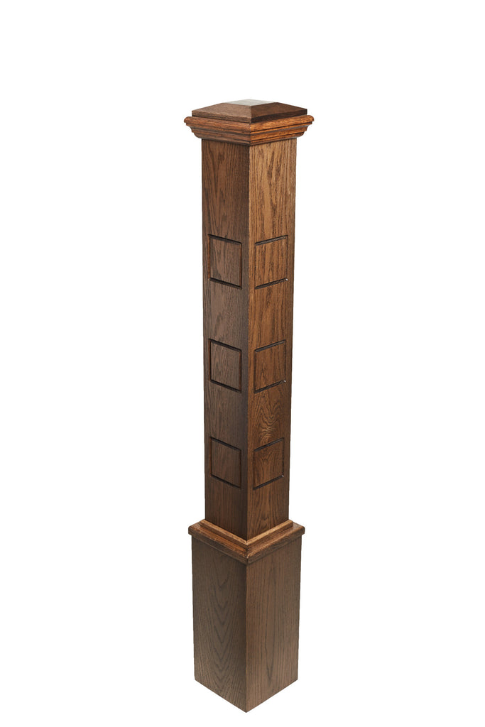 A modern box newel post that features a set of 3 carved squares.