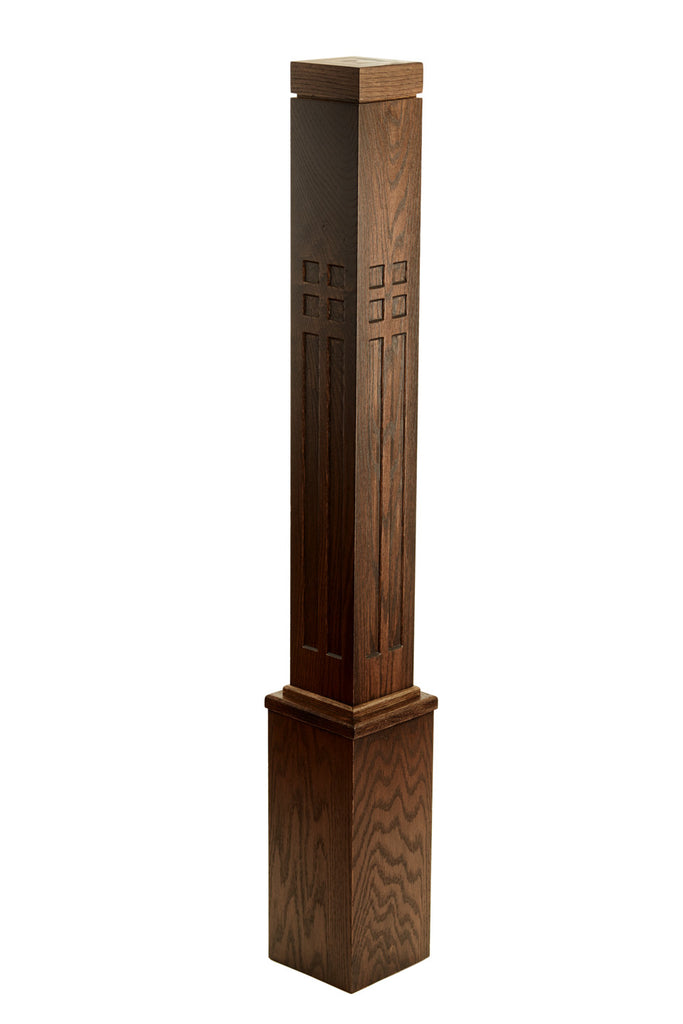 A craftsman style box newel post with 3 recessed panels and a boot.