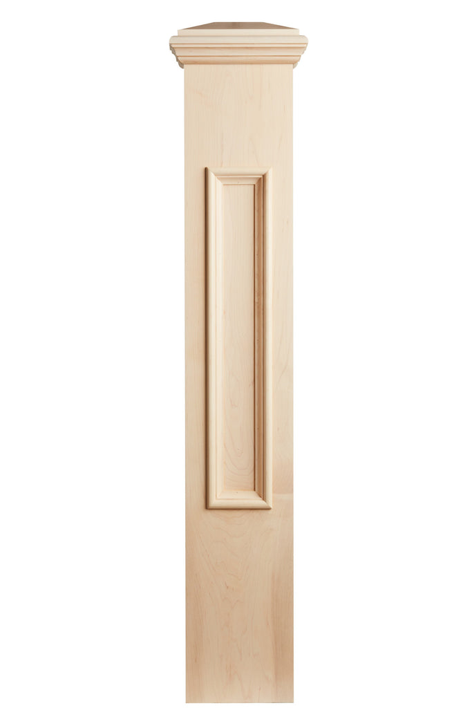 Heritage style boxed newel post with recessed panels trimmed with Victorian moldings.