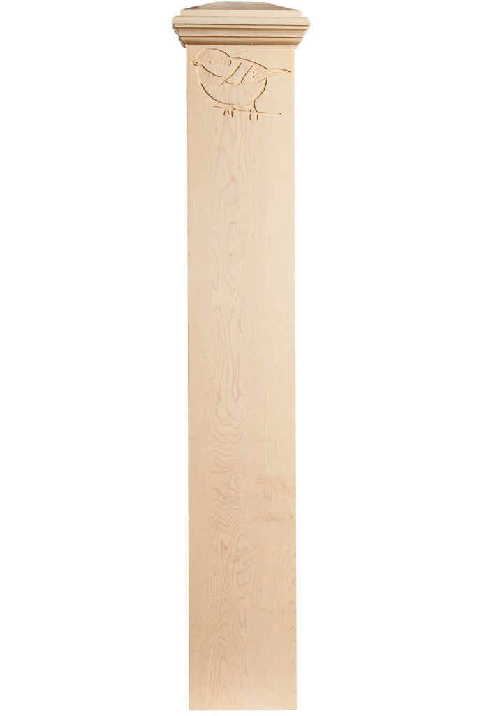 A box newel post featuring a carved sparrow. Inspired by nature, this post brings organic style to your stairs.