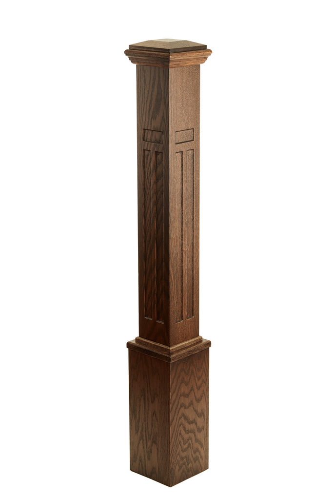 A craftsman style box newel post with 3 recessed panels and a boot.